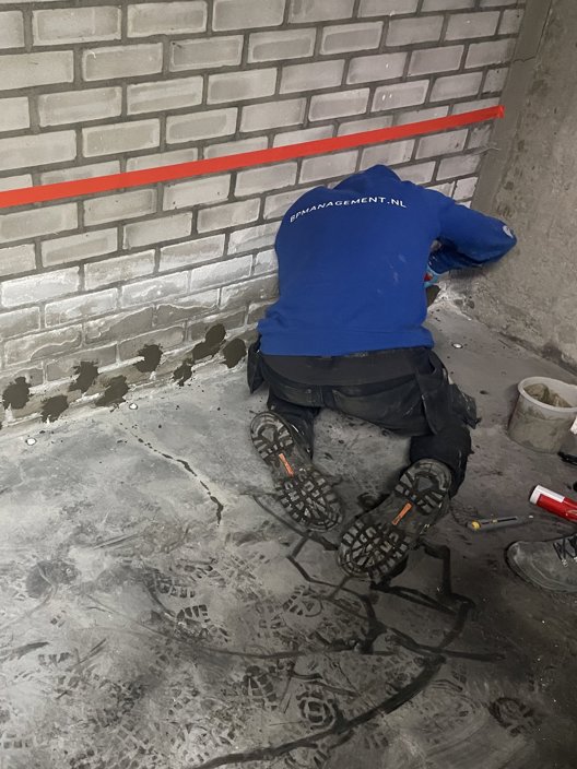 Indien er overlast is van vocht door de gevel zijn hier verschillende oplossingen voor om toe te passen om dit tegen te gaan. In dit geval is de gevel geïnjecteerd met een vochtwerend middel. En ook extra afgewerkt met een vochtwerende laag.